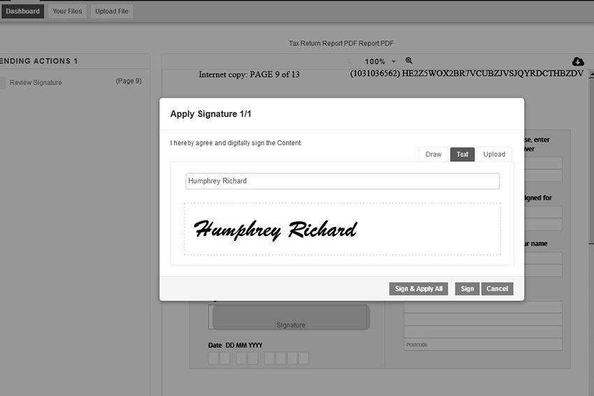 To e-sign click the ‘Sign & Apply to All’ button, as indicated by the arrow.